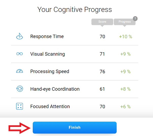 By clicking on Next, the patient will see the scores for each cognitive skill from the training session and their progress.