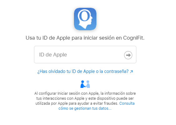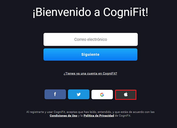 Para inscribirse en CogniFit utilizando tu ID de Apple, selecciona el botón con el ícono de Apple.