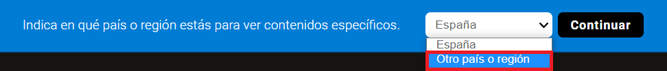 Si quieres cambiar de país o región, haz clic en la flecha del menú desplegable y selecciona la opción «Otro país o región«. Pulsa el botón «Continuar«.