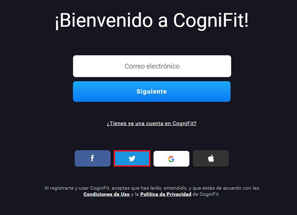 Para inscribirse en CogniFit utilizando tu cuenta de Twitter, selecciona el botón con el ícono de Twitter.