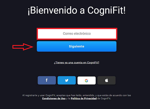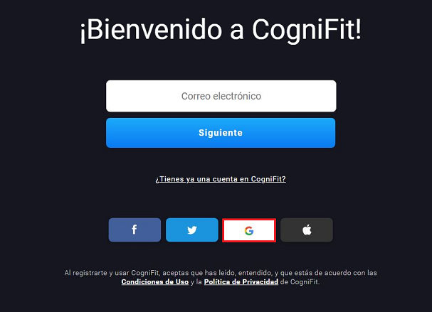 Para registrarse en CogniFit a través de Facebook, Google o Twitter, selecciona el botón correspondiente.