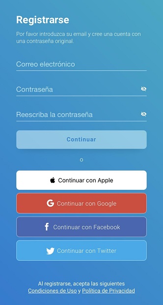 Para registar una cuenta de CogniFit utilizando Facebook, Twitter, Google o Apple ID, selecciona el botón correspondiente.