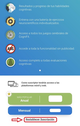 Si has comprado una suscripción a CogniFit a través de nuestra aplicación para iOS o Android y no puedes ver la compra, tendrás que restaurar esa compra a través de los siguientes pasos: