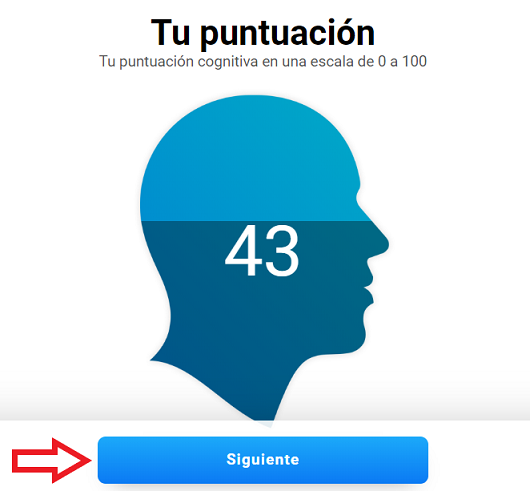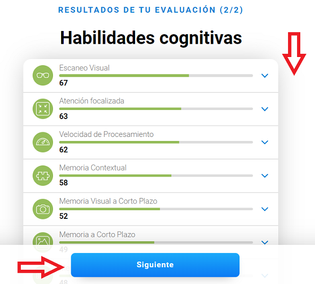 Al hacer clic en el botón Siguiente, el paciente verá una puntuación para cada capacidad cognitiva evaluada durante la prueba. Desplázate hasta el final de la página para ver todas las puntuaciones.