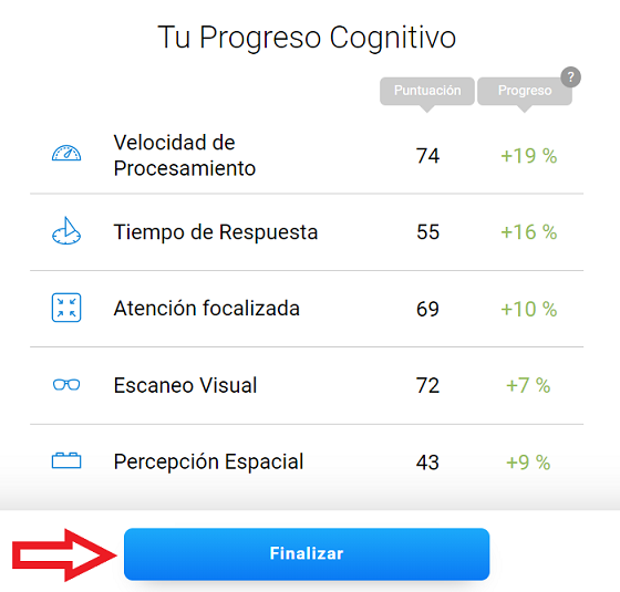 Al hacer clic en Siguiente, el paciente verá las puntuaciones de cada capacidad cognitiva obtenidas en la sesión de entrenamiento y su progreso.