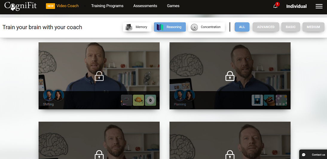To access the Video Coach feature, the user will need to have an active CogniFit Subscription. If you do not have a subscription, you can click on the Lock icon on the middle of each of the Video Coach sessions.