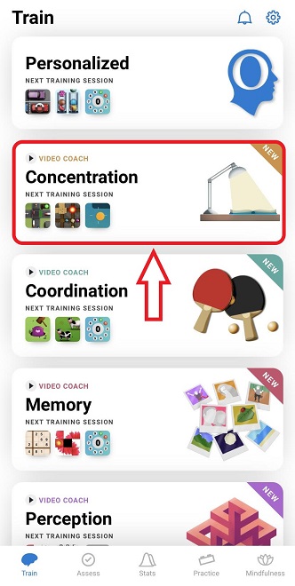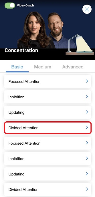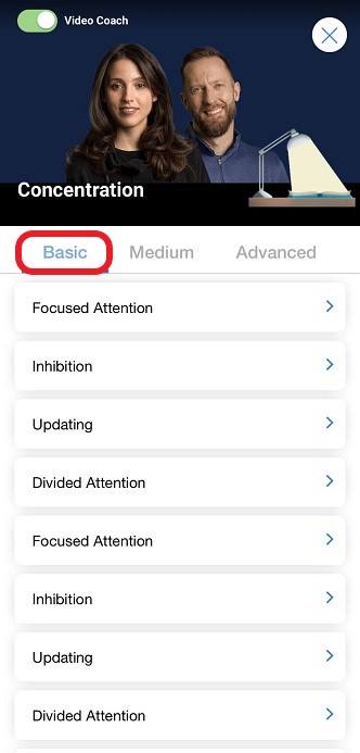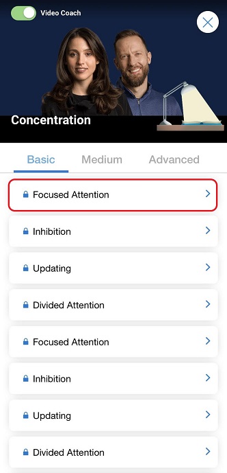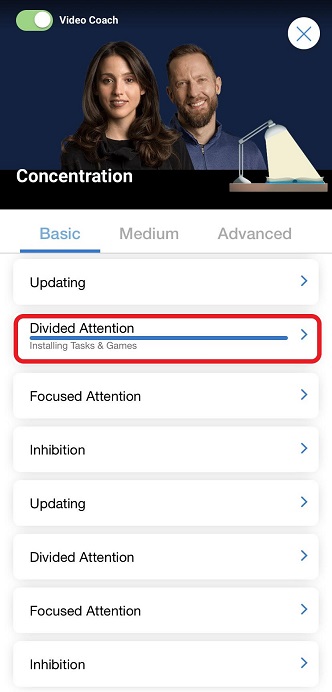 Once you have selected the desired difficulty, the next step to begin the Video Coach training session is to tap on the cognitive skill you wish to train.