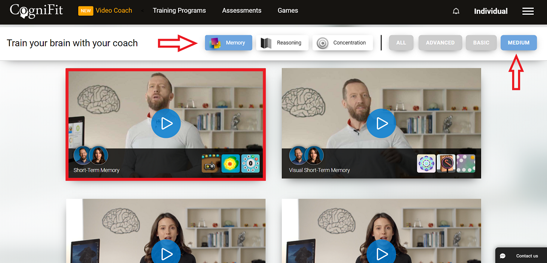 Video Coach can be located in the main section of the CogniFit platform for individuals. Here are the steps to locate it: