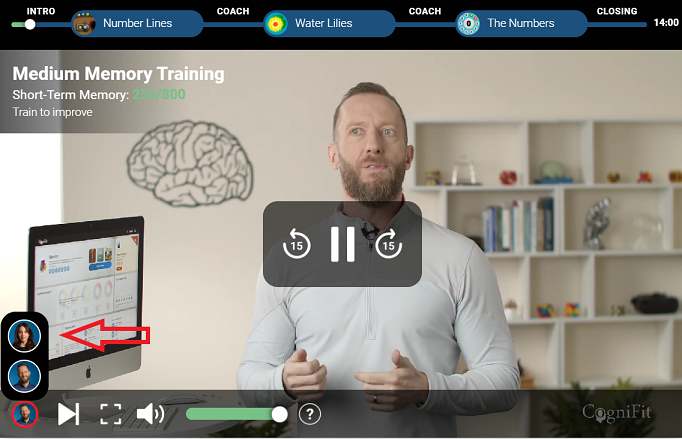 AttentionOnce you have selected a Video Coach trainer, that choice will be selected by default for future Video Coach training sessions. You may change your selections at any time. If you want to change your video coach during a training session, click on the coach icon in the left corner of the screen and then select another coach and click on his or her picture. You will then begin training with the selected coach.