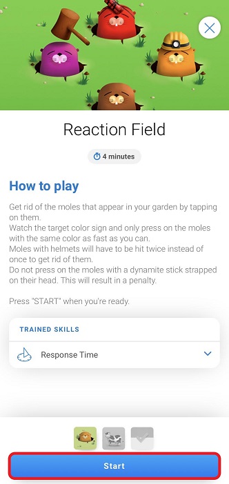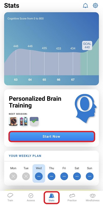 2.1. Log in to your account in the CogniFit mobile app. You can start your personalized training from the Stats menu option at the bottom of the screen. Click on “Start now“.