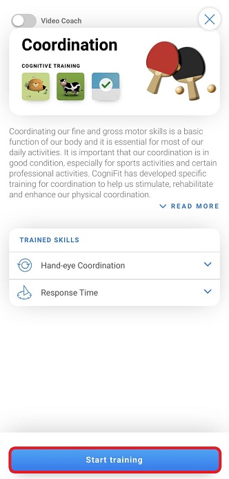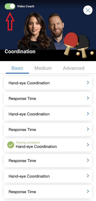 Note: By default, you will be offered a training session with a video coach. Read more about how to train with video coaching here. If you prefer, you can deactivate this option by clicking on the slider in the upper left corner of the screen.