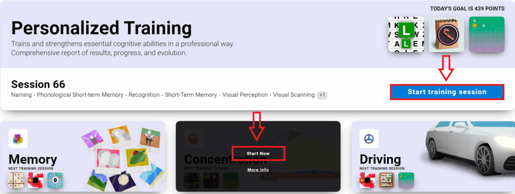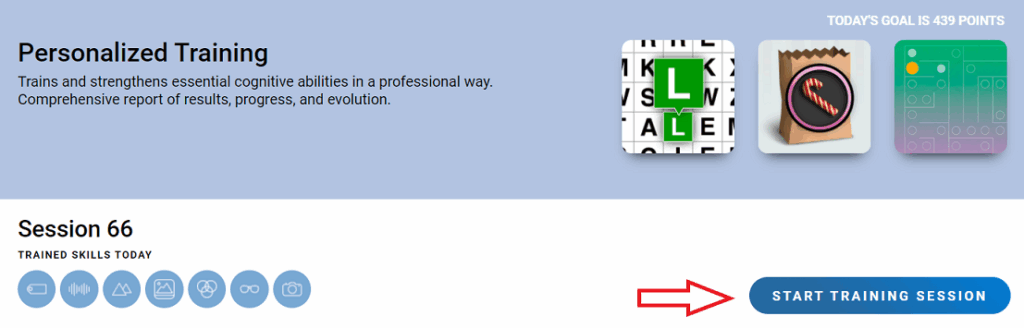 1.1. Log in to your CogniFit account. You can start training on the home page of your account. Click on the “Start training session” button.