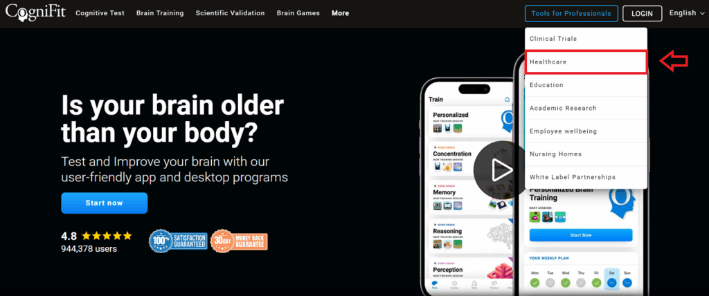 1.1 To register from the main page of CogniFit choose the option “Healthcare” in the tab “Tools for Professionals” at the top of the screen