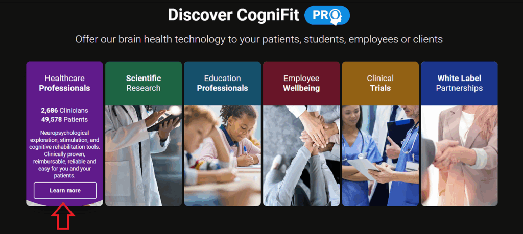 or scroll down the CogniFit home page to the “Healthcare Professionals” section and click the “Learn More” button.