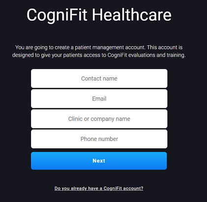 Fill in the required fields and click Next. This email address will be used to send you important account information and patient progress.