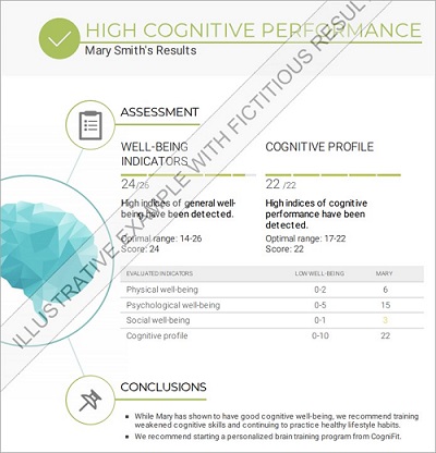Once the questionnaire and tasks have been completed, the user can download a complete results report. The report includes information on the user’s cognitive profile, their scores in the various cognitive areas, and the results of the areas of the questionnaire. Each score is carefully explained throughout the report—including an index based on the answers to the questionnaire, as well as conclusions and recommendations for the user.