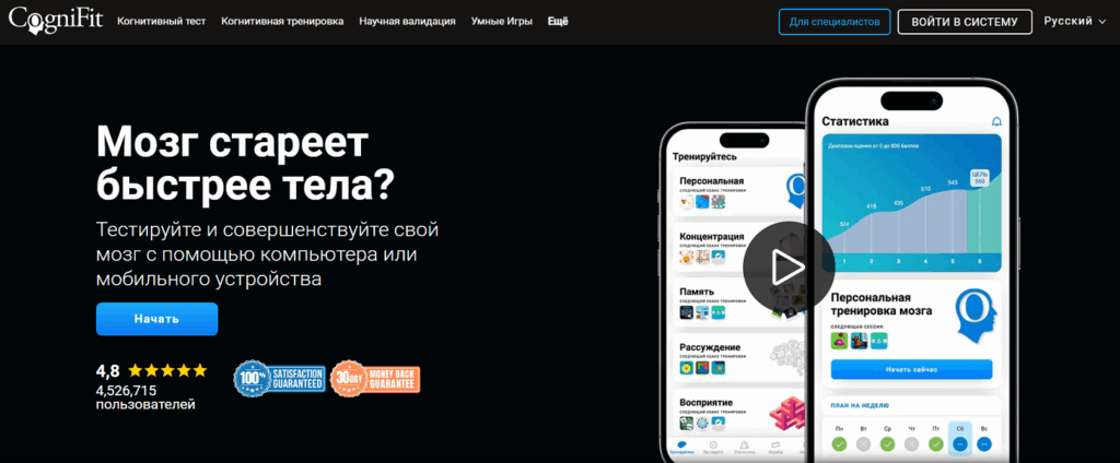 CogniFit эффективна, поскольку создает индивидуальную программу когнитивной тренировки для каждого пользователя. После регистрации пользователю предлагается бесплатный начальный когнитивный тест, который поможет оценить текущее состояние когнитивных способностей и предложить оптимальную персональную тренировку.